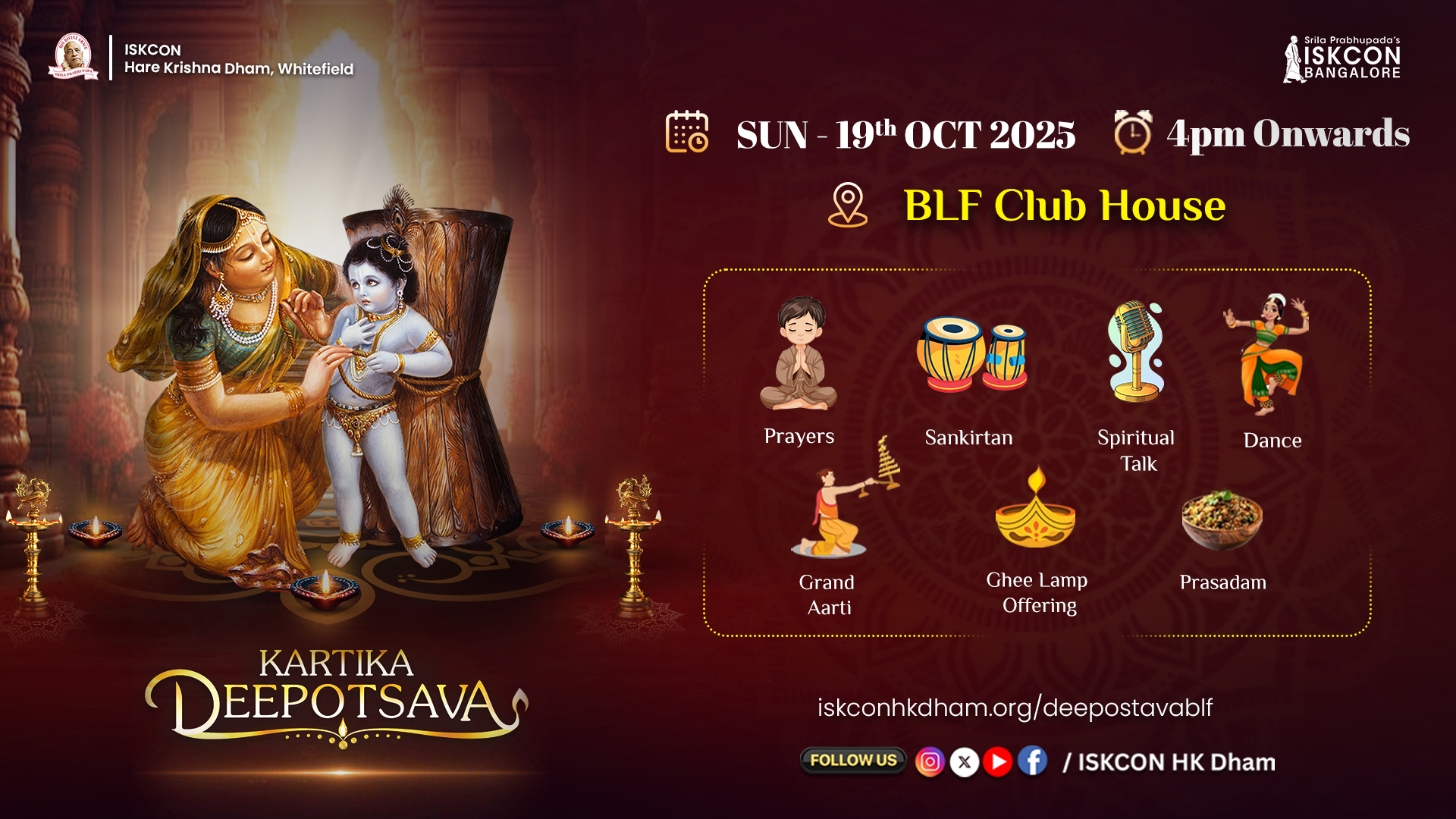 Deepotsava or Deepotsavam, also known as the festival of lights, is celebrated every year in the month of Kartika (October–November). It is a month-long festival commemorating Damodara-lila, the sweet pastime of baby Krishna stealing butter and consequently being tied to a mortar by His dear mother, Yashoda. In Sanskrit, “dama” means rope and “udara” means belly. Damodara refers to Krishna, who was bound with a rope by His mother, Yashoda.